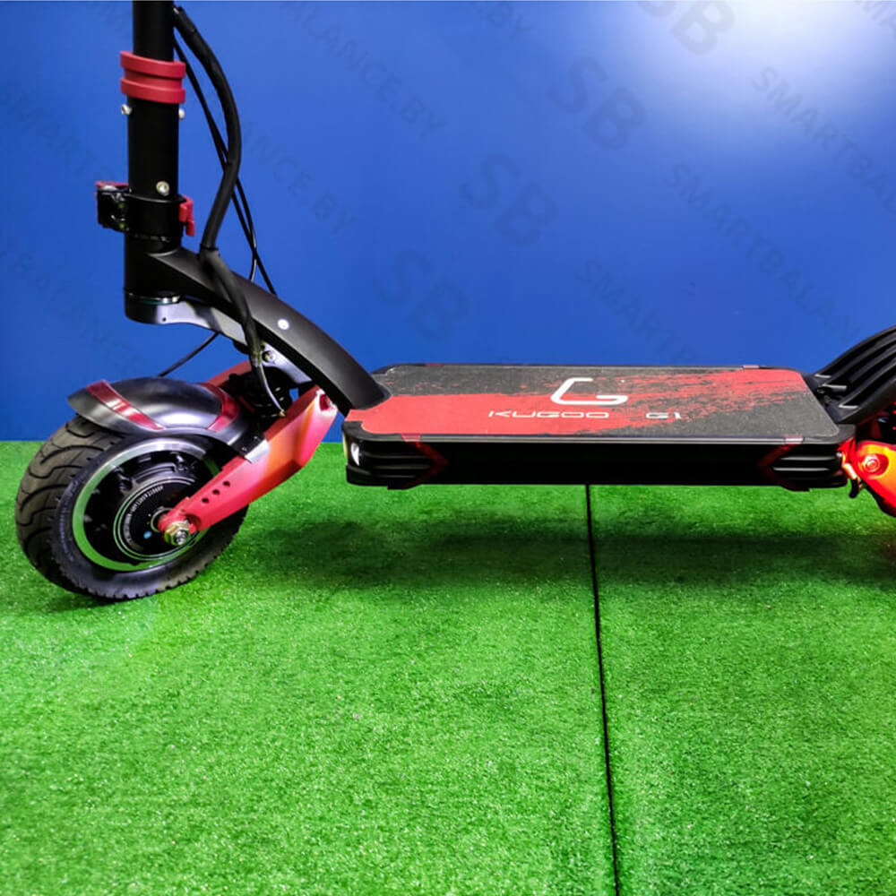 Электросамокат Kugoo G1 (Jilong) – это полноприводный внедорожник, отлично приспособленный для российских дорог. Он мощный, быстрый и надёжный. Ездить по любым, даже самым неровным дорогам, можно с комфортом, благодаря 10-дюймовым колёсам, и приподнятой деке, которые образуют высокий клиренс, чтобы преодолевать препятствия. А инновационная система амортизаторов наряду с пневматическими колёсами смягчают езду, поглощая вибрацию и тряску. У Куга Джи 1 два мотора, каждый по 1000 Ватт, что в совокупности даёт общую максимальную мощность 2000Ватт. Поэтому эта модель легко справляется с нагрузками, типа подъёма, высокой скорости, веса. Кстати, разогнаться этот зверь может до 24 км/ч.