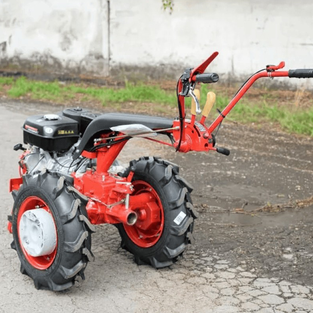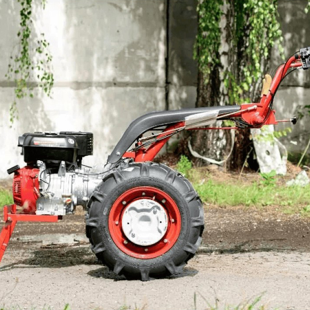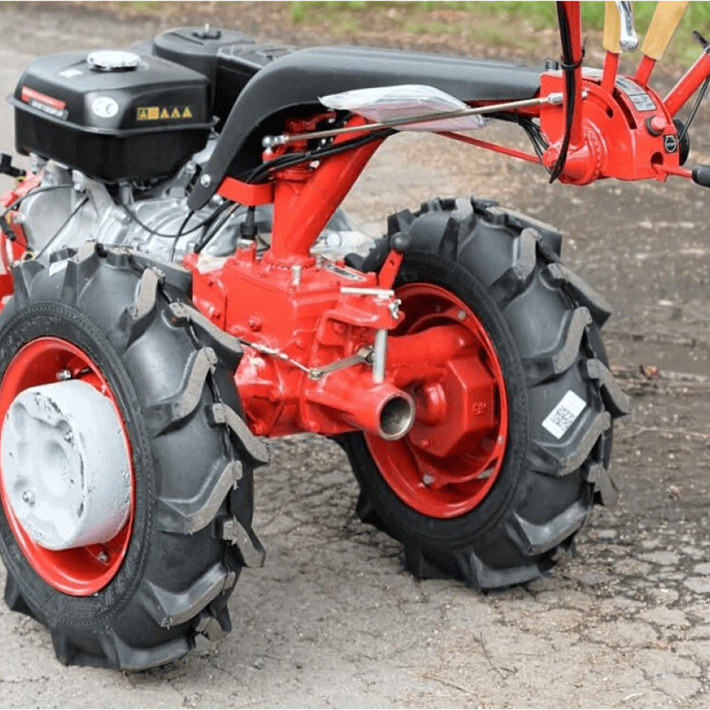 • Шины 6L-12 (Низкого давления): В отличие от стандартной узкой резины (6.00-12), шины 6L-12 имеют более широкое пятно контакта и мягкий ход. Это дает повышенную проходимость на рыхлой почве и лучшее сцепление при работе с плугом.